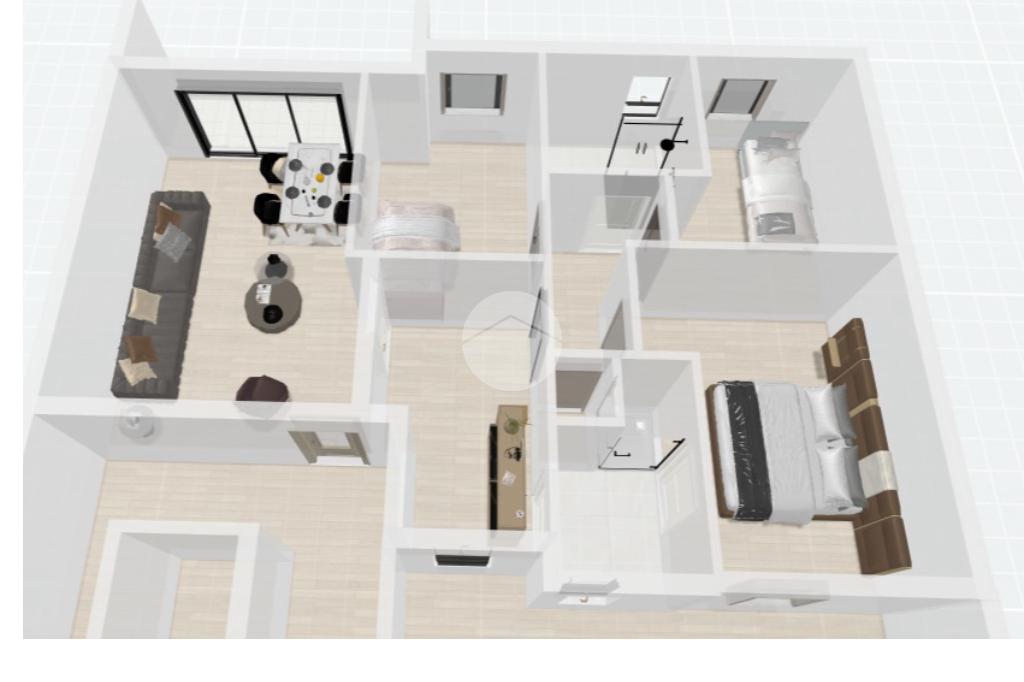 La disposizione interna è la seguente: soggiorno, cucina separata, due bagni, tre camere da letto, ripostiglio.
